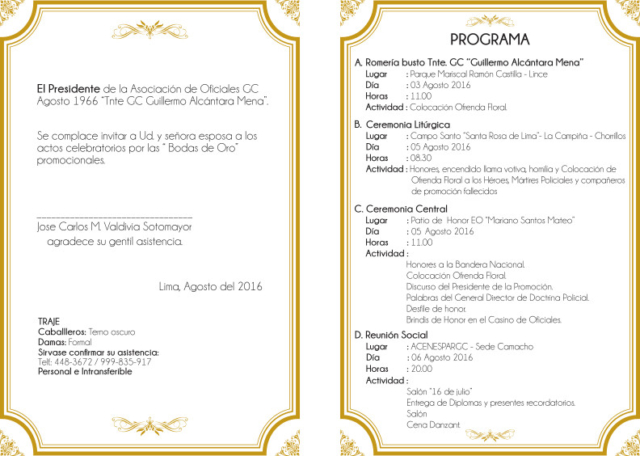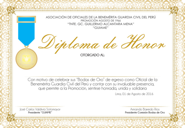 Se convoca a los miembros de la Asociación de Oficiales de la Benemérita Guardia Civil del Perú a participar en las próximas celebraciones por las «BODAS DE ORO» promocionales. Las fechas y horarios se pueden ver más abajo.